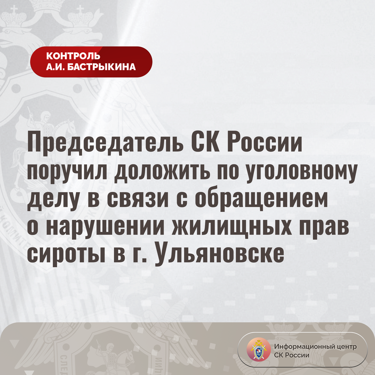 Председатель Следственного комитета Российской Федерации Александр Иванович Бастрыкин поручил руководителю СУ СК России по Ульяновской области Сергею Юрьевичу Михайлову представить доклад о ходе и результатах расследования уголовного дела, а также проанализировать ситуацию в регионе в целом по обеспечению лиц, относящихся к категории дет
