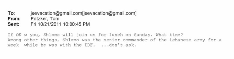Epstein 2011 exchange with Hyatt billionaire implies IDF's 'SHLOMO' was a Lebanese Army 'senior commander' for a WEEK
