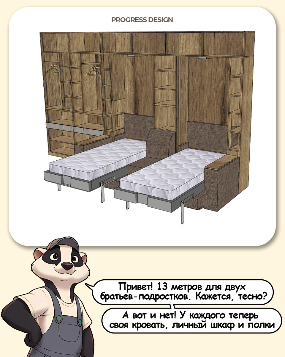 Какая кровать вам подходит? Каталог готовых проектов и цены на мебель: https://t.me/progressdesignBot Пройдите быстрый опрос и получите персональное предложение на кровать-трансформер: https://clck.ru/342axA