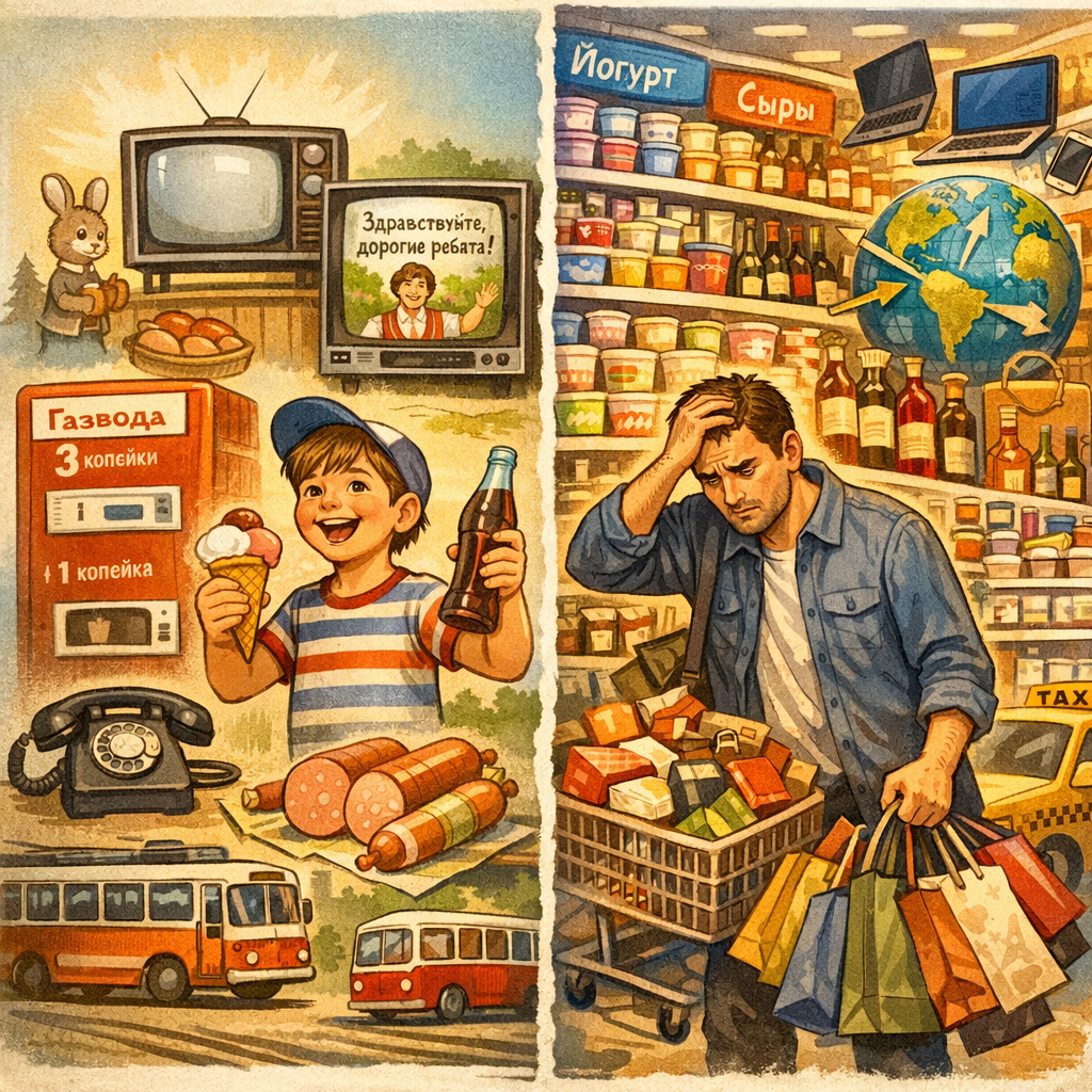 Когда я был ребёнком, мир был простым. Понятным, как пять копеек. Десять сортов мороженого. Может, чуть больше, память лишнее стёрла. Два телевизионных канала и два вида «ящиков», чтобы их смотреть: чёрно-белый и цветной. Всё. Никаких мук выбора. В гастрономе тоже всё чётко: два сорта колбасы, сосиски. Телефонных аппаратов два вида, крути диск, жди гудка. Газировка в автомате отдельная магия. С сиропом три копейки, сладкое счастье. Без сиропа копейка. Она била пузырьками в нос так, что слёзы из глаз. С развлечениями было строго. Мультики, священный грааль, доступный только по воскресеньям. По субботам «В гостях у сказки». И каждый раз звучало как пароль: «Здравствуйте, дорогие ребята и уважаемые товарищи взрослые». Сердце замирало. Были ещё «Будильник», «Спокойной ночи», «АБВГДейка», «Хочу всё знать». Но я их смотрел редко. Жизнь была во дворе, а не в экране. Транспорт — святая троица: автобус, троллейбус, трамвай. Такси — это роскошь, дорого. Но в Москве мы иногда шиковали. Особенно к