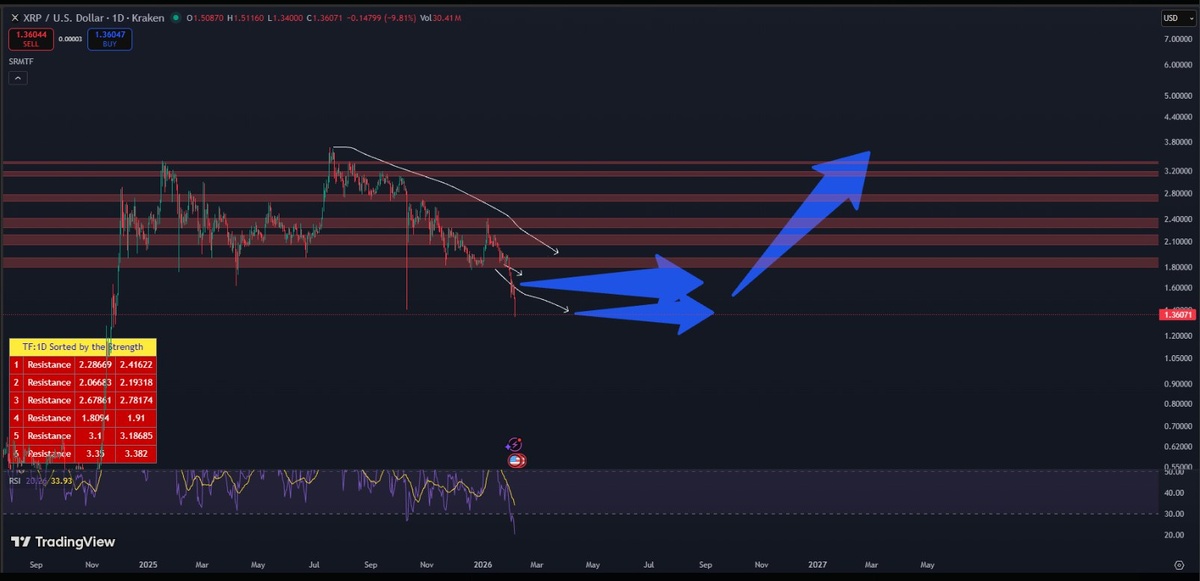 📉 XRP упал примерно вдвое от октябрьского открытия около $2.80 до $1.42, к 5 февраля 2026 года. Это привело к экстремально низкому показателю RSI — около 17, что является самым низким значением за более чем десять лет. Аналитики указывают, что в прошлом такие уровни RSI часто приводили к быстрому отскоку на 15-40% в течение двух недель. 📊 Ключевые моменты: - RSI XRP упал до 17, исторически это предшествовало отскокам на 15-40%. - Предыдущие отскоки: 70% за полмесяца (после октябрьского минимума), 65% и 35% за короткие периоды в 2024 году. - Ключевые уровни сопротивления: $2.25, $4.20-$4.40. - XRP/ETH и XRP/BTC показывают относительную силу, доминирование XRP удерживается около 3.5%-3.6%.
