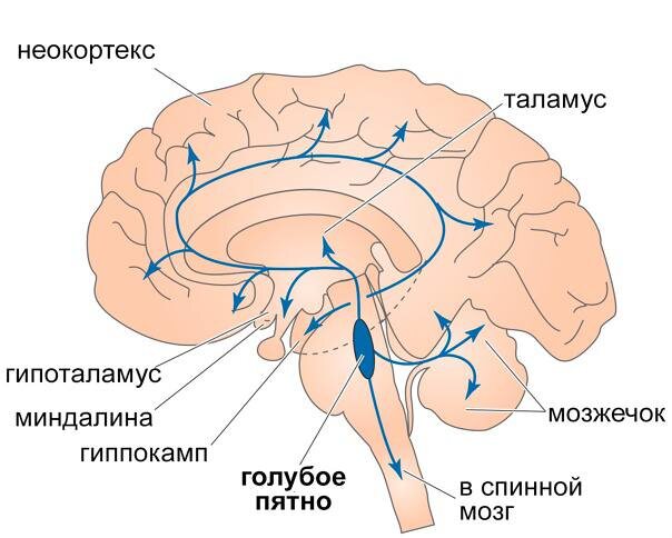 В нашем мозге есть маленькая, но очень важная область, которая называется голубое пятно, или по-латински locus coeruleus. Почему «голубое»? Потому что нейроны этой зоны окрашены в слегка голубоватый цвет. Несмотря на свои маленькие размеры, эта область играет огромную роль ➡️ она вырабатывает норадреналин и рассылает его по всему мозгу и телу. Что это значит на практике? Нейроны голубого пятна имеют длинные ветвящиеся отростки - аксоны, которые доходят до разных частей мозга: ▪️коры больших полушарий (там мы думаем и анализируем), ▪️гипоталамуса (центр управления стрессом и гормонами), ▪️спинного мозга, а также до других частей центральной нервной системы. С помощью этих отростков норадреналин влияет на наше настроение, внимание, память, реакцию на стресс и даже боль. Когда голубое пятно активно, мы становимся: ✅Бодрыми и энергичными - сердце бьется чаще, кровь идет к мышцам, мы готовы к действию. ✅Внимательными и сосредоточенными - норадреналин в умеренной концентрации улучша