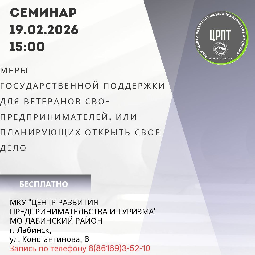 ! 🚀19.02.2026 года в 15:00 в муниципальном казенном учреждении «Центр развития предпринимательства и туризма» муниципального образования Лабинский район пройдет семинар на тему «Меры государственной поддержки для ветеранов специальной военной операции – предпринимателей, или планирующих открыть свое дело». ⚠️Семинар будет проводиться по адресу: г. Лабинск, ул. Константинова, 6. ☎️Телефон для записи 8(86169)3-52-10.