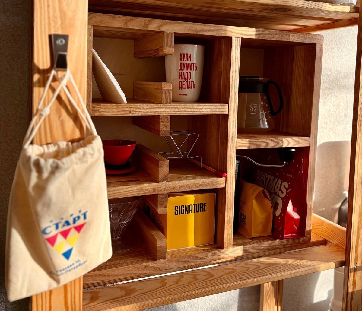 Может, стеллаж и не идеальный, хотя кроме автора изделия это мало кто заметит, зато он уникальный, сделанный по своей задумке, с нужными размерами. Главное, что сделан он своими руками, а сам Михаил получил удовольствие от процесса. В проекте использован мебельный щит из ясеня 20мм толщиной, бесцветное мебельное масло, сборка выполнена на шканты и столярный клей. P.S. Отдельное спасибо от нас, что фотографию стеллажа уже в домашнем интерьере Михаил прислал нам ту, что с лучами утреннего солнца.