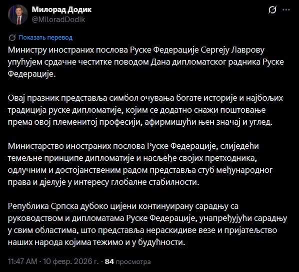 ) «Министру иностранных дел Российской Федерации Сергею Лаврову направляю сердечные поздравления по случаю Дня дипломатического работника Российской Федерации. Этот праздник является символом сохранения богатой истории и лучших традиций российской дипломатии, что дополнительно укрепляет уважение к этой благородной профессии, утверждая ее значимость и авторитет. Министерство иностранных дел Российской Федерации, следуя фундаментальным принципам дипломатии и наследию своих предшественников, решительной и достойной работой представляет собой столп международного права и действует в интересах глобальной стабильности. Республика Сербская высоко ценит непрерывное сотрудничество с руководством и дипломатами Российской Федерации, развивая взаимодействие во всех сферах, что представляет собой неразрывные связи и дружбу наших народов, к которым мы стремимся и в будущем» Додик в последнее время достаточно часто встречался с российскими властями, в том числе с Лавровым, с которым у них хорош