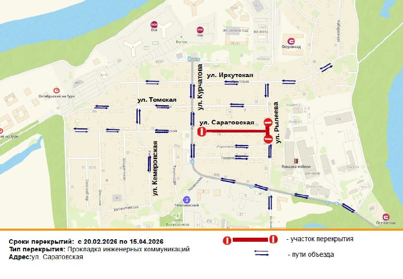 В связи с выполнением работ по подключению к сетям водоснабжения комплекса многоэтажных жилых домов в период с 20.02.2026 по 15.04.2026 планируется прекращение движения транспортных средств: - по автомобильной дороге ул. Саратовской на участке от ул. Рылеева до ул. Курчатова и - по автомобильной дороге ул. Рылеева в районе ул. Саратовской. Участников дорожного движения просим обращать внимание на знаки, заранее планировать маршрут, соблюдать Правила дорожного движения РФ. Возможные маршруты объезда: ул. Курчатова, ул. Томская ул. Саратовский переулок. Департамент дорожной инфраструктуры и транспорта