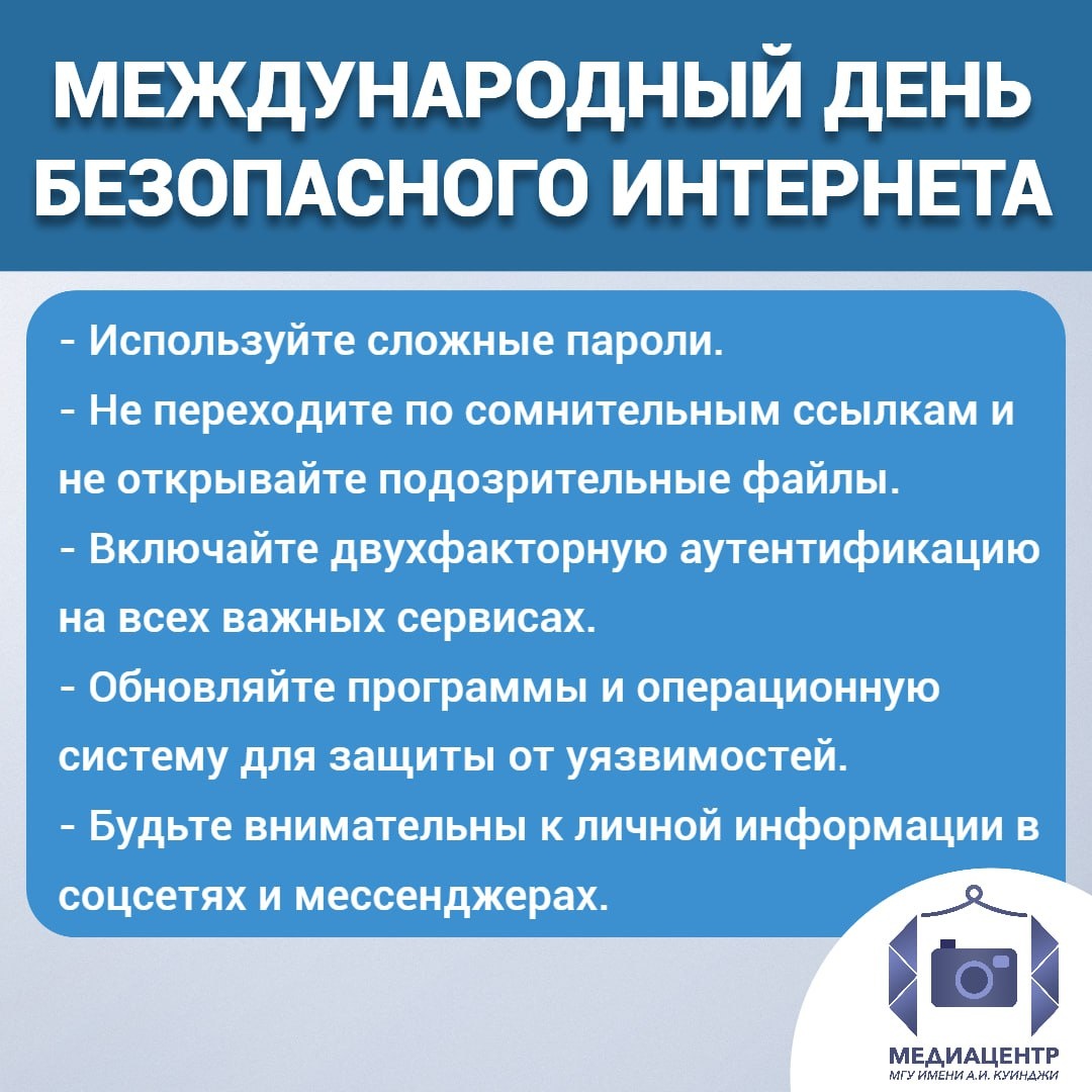 ! Интернет открывает безграничные возможности: учиться, общаться, работать и развлекаться. Но вместе с этим приходит и ответственность — защищать себя, своих близких и данные в цифровом пространстве. 🔒 Сегодня особенно важно помнить: 🟡Используйте надёжные пароли и двухфакторную аутентификацию. 🟡Не переходите по подозрительным ссылкам. 🟡Ограничьте публичный доступ к личной информации. 🟡Вовремя обновляйте ПО анти-вируса. 💻 Безопасный Интернет начинается с каждого из нас. Давайте делать онлайн-мир добрее, умнее и надёжнее! 🎨Войтенко Мария, 2 курс, ФФМК, Журналистика ✏️Аджавенко Артем, 1 курс, ФЭУП, Туризм 🌐Telegram🌐ВКонтакте🌐Rutube 📲 MAХ #МедиацентрМГУимениКуинджи