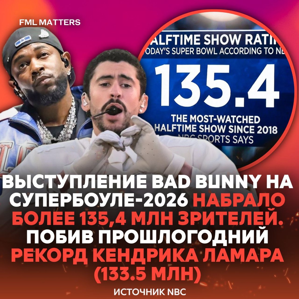 ‼️ BAD BUNNY УНИЧТОЖИЛ KENDRICK LAMAR! По данным от NBC, выступление Bad Bunny на Супербоуле собрало более 135.4 миллионов зрителей, побив прошлогодний рекорд Кендрика Ламара (~133.5 млн). Это делает его самым просматриваемым шоу в истории перерывов Супербоула. Красавчик? ❤️🔥 / 👎 💀 FML MATTERS