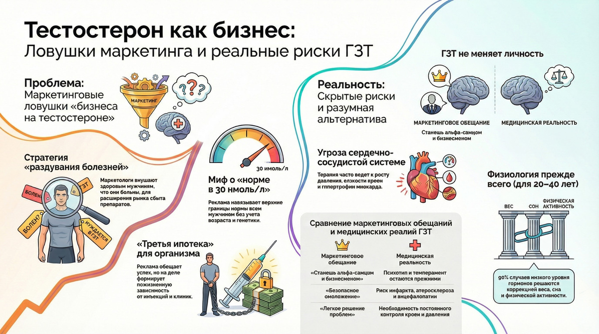 В этой бизнес-схеме активно эксплуатируется термин «андропауза» или мужской климакс. Хотя официально такого медицинского диагноза не существует, он идеально подходит для маркетинга. Создается замкнутый круг: понятие мужественности становится неотделимым от потребления фармацевтических продуктов. Ты не можешь считаться настоящим мужчиной без уколов и постоянного мониторинга анализов.