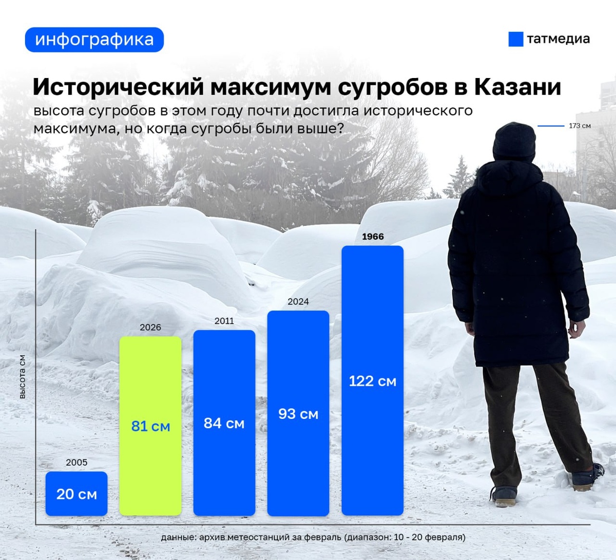 ❄️📈60 лет назад в Казани сугробы были на 40 см выше текущих Тем не менее, сегодня высота снежного покрова уже превысила многолетние наблюдения. @tatmediaofficial | Татмедиа в MAX