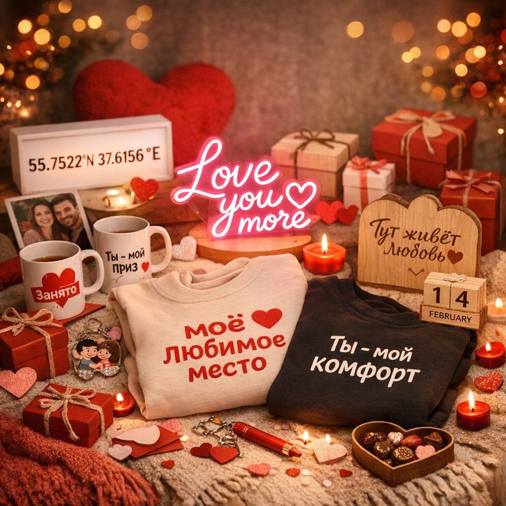 День святого Валентина — это не про «ещё одно сердечко». Это про внимание, юмор и детали, которые хочется оставить, а не спрятать в ящик. В Ва Групп мы уверены: Лучший подарок — тот, который выглядит как «я старался(ась)», даже если дедлайн был вчера. Когда банальные подарки не вариант: Цветы завянут. Шоколад закончится. А вот персональный подарок — останется. Поэтому включаем: — печать — гравировку — неон — и немного романтики (без перебора). Идеи подарков, которые говорят вместо вас 1. Свитшоты и футболки с характером Не «Love forever», а: — «ты — мой комфорт» — «моё любимое место» — «мы странные, но вместе» DTF-печать позволяет сделать ярко, аккуратно и надолго — как чувства, конечно же. 2. Деревянные таблички и декор с гравировкой. Идеально для дома и офиса. Примеры: — «тут живёт любовь» — «не входить без объятий» — координаты первого свидания Минималистично, тепло и очень по-настоящему. 3. Неон — для тех, кто любит эффект «вау». Если хочется не просто подарок, а эмоцию. Фразы: — «
