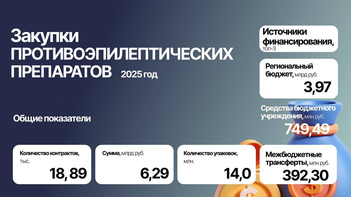 Международный день борьбы с эпилепсией - повод ещё раз обратить внимание на поддержку людей с эпилепсией: защиту их прав, доступность терапии и разрушение устойчивых стереотипов. По данным ВОЗ, с эпилепсией живут около 75 млн человек по всему миру, и ежегодно диагностируется порядка 2,5 млн новых случаев. Важно помнить: эпилепсия - это заболевание, которое поддаётся лечению. При правильно подобранной терапии до 70% пациентов могут жить без приступов. Общий объём закупок составил 6,29 млрд руб. Рынок демонстрирует устойчивый рост и достиг пиковых значений за период 2021–2025 гг.: • 2021 — 2,92 млрд руб. • 2022 — 4,17 млрд руб. • 2023 — 5,32 млрд руб. • 2024 — 5,77 млрд руб. • 2025 — 6,29 млрд руб. 🔹 Ключевой источник финансирования — региональные бюджеты (3,97 млрд руб.), что указывает на высокую нагрузку на субъекты РФ. 🔹 Рынок остаётся концентрированным: ТОП-5 МНН формируют более 38% закупок в денежном выражении. 🚀 Лидеры роста среди ТОП-10 ТН: 1️⃣ Талопса (+146%) 2️⃣ Вигабатрин