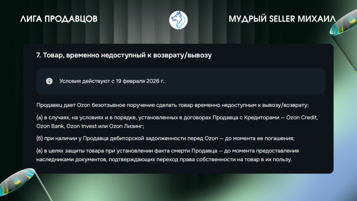 Новое правило Ozon (вступает в силу 19 февраля) легализует удержание имущества селлера при наличии любой финансовой задолженности перед экосистемой. Блокировка действует до полного погашения задолженности. ‼️ С февраля 2026-го любая техническая ошибка или копеечная дебиторка перед Ozon может заблокировать вывоз крупной партии товара. Рекомендую раз в месяц проводить сверку и не допускать «висящих» долгов. Особенно это касается тех, кто пользуется услугами лизинга или инвестиций от площадки — теперь это напрямую влияет на вашу логистику ⬇️ А что вы думаете по этому поводу? 📱 ПОДПИСАТЬСЯ в Telegram 📱 Подписаться ВК Консультация Мудрого|Юнитка Ozon|Закрытый-чат продавцов