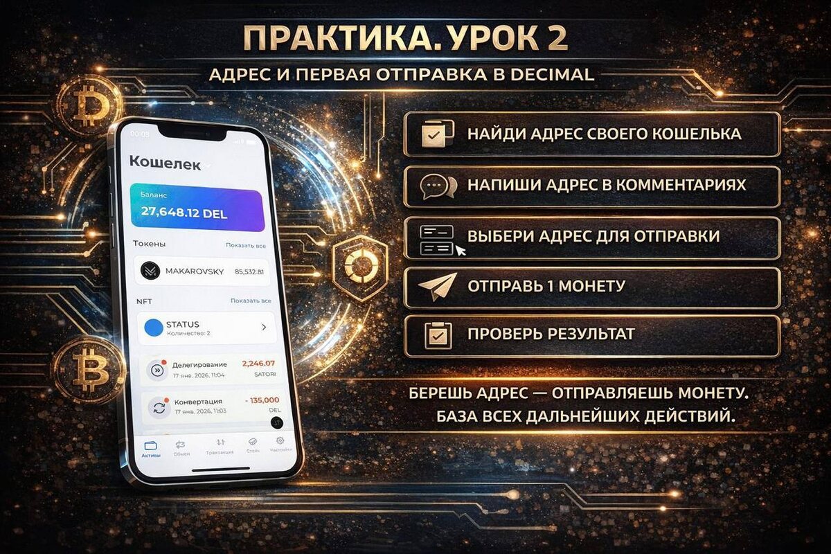 Урок 2 - адрес и первая отправка в Decimal В этом уроке ты делаешь два ключевых действия: публикуешь адрес кошелька и отправляешь свою первую транзакцию. 1️⃣ Найди адрес своего кошелька Открой Decimal Wallet и: 🟣в нижнем меню нажми «Транзакция» 🟣сверху нажми «Получить» 🟣скопируй адрес кошелька (формат 0x...) ❗️ Это публичный адрес ❗️ Его можно показывать ❗ Seed-фразу не показывают никогда 👉 Цель шага: понять, что такое адрес и зачем он нужен. Это твой адрес кошелька - аналог номера банковской карты для приёма средств. 2️⃣ Напиши адрес в комментариях Под этим постом: ⏩ вставь только адрес кошелька ⏩ без текста ⏩ без лишних символов ❗️ Это касается только новичков в крипте. Если ты уже работал с кошельками - адрес не публикуем. 👉 Цель шага: зафиксировать адрес и подготовиться к транзакции. 3️⃣ Выбери адрес для отправки Дождись, когда криптовалюта поступит на твой кошелёк. После этого, когда в комментариях появятся адреса кошельков других подписчиков канала: ⏩ выбери любой
