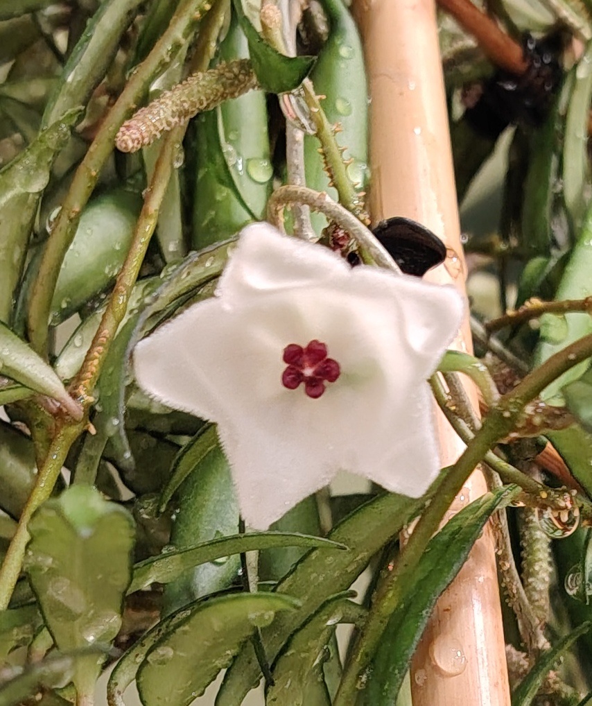 На просторах инета пишут о данной хойе следущее: Hoya pauciflora (хойя паусифлора, малоцветковая) — вид , родом из юго-западной Индии, острова Шри-Ланка (Цейлон) и Бирмы.В своем ареале обитания предпочитает тенистые места в предгорьях между скал с высокой влажностью воздуха и предпочитает прохладу. Ко мне хойя попала черенком. Из-за густонаселенности квартиры растениями, вынуждена была посадить два черенка двух разных видов хой в один горшок. Вот и получилось, что хойя пауцифлора растет теперь с хойей ... Растут в керамическом горшке в грунте мусорном (всего напихано понемногу). Условия не скажу, что совпадают с природными. И влажность низкая, и свет не очень. Подсветка есть , стоит горшок в углу полки. Грунт просыхает. Температура воздуха в среднем +22. Поливаю иногда под душем. Цветет с каждым годом все обильнее, если этот термин можно применить к "малоцветковой" хойе.