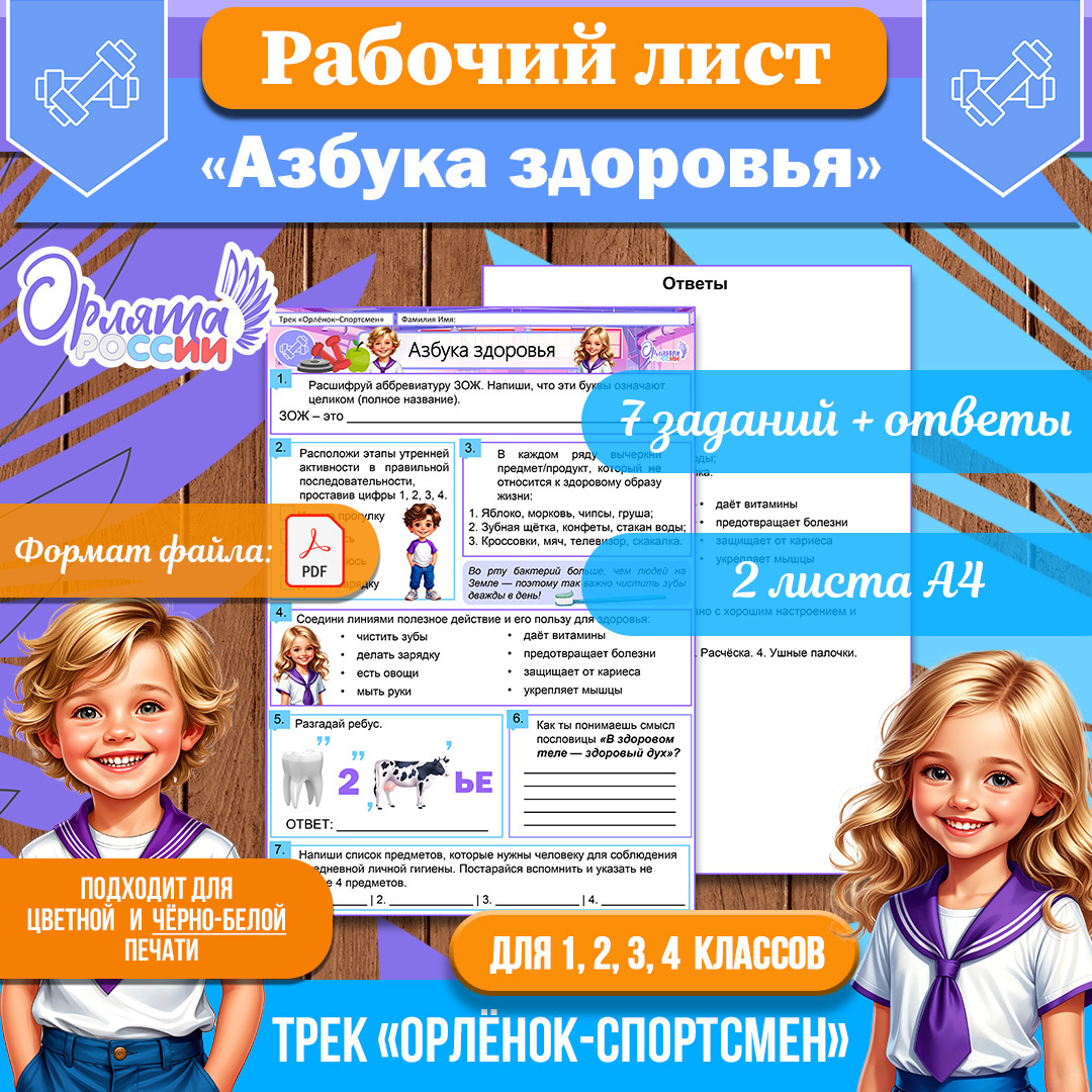 Рабочий лист «Азбука здоровья» разработан для внеурочной деятельности в рамках программы «Орлята России» к треку «Орлёнок-Спортсмен». Помогает в игровой и познавательной форме закрепить у младших школьников представления о здоровом образе жизни, физической активности и базовых правилах заботы о здоровье.