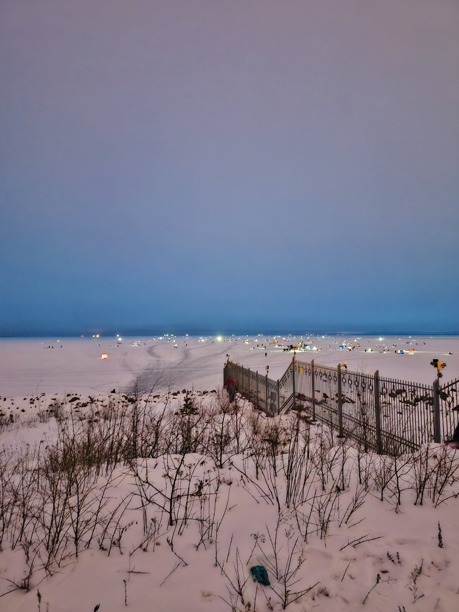 В 6.20 утра приехали на дамбу. Мест для парковки уже было совсем мало. На лёд по темноте решили не идти, около часа сидели в машине и болтали. Наконец стало светать и мы отправились на лёд Финского залива.