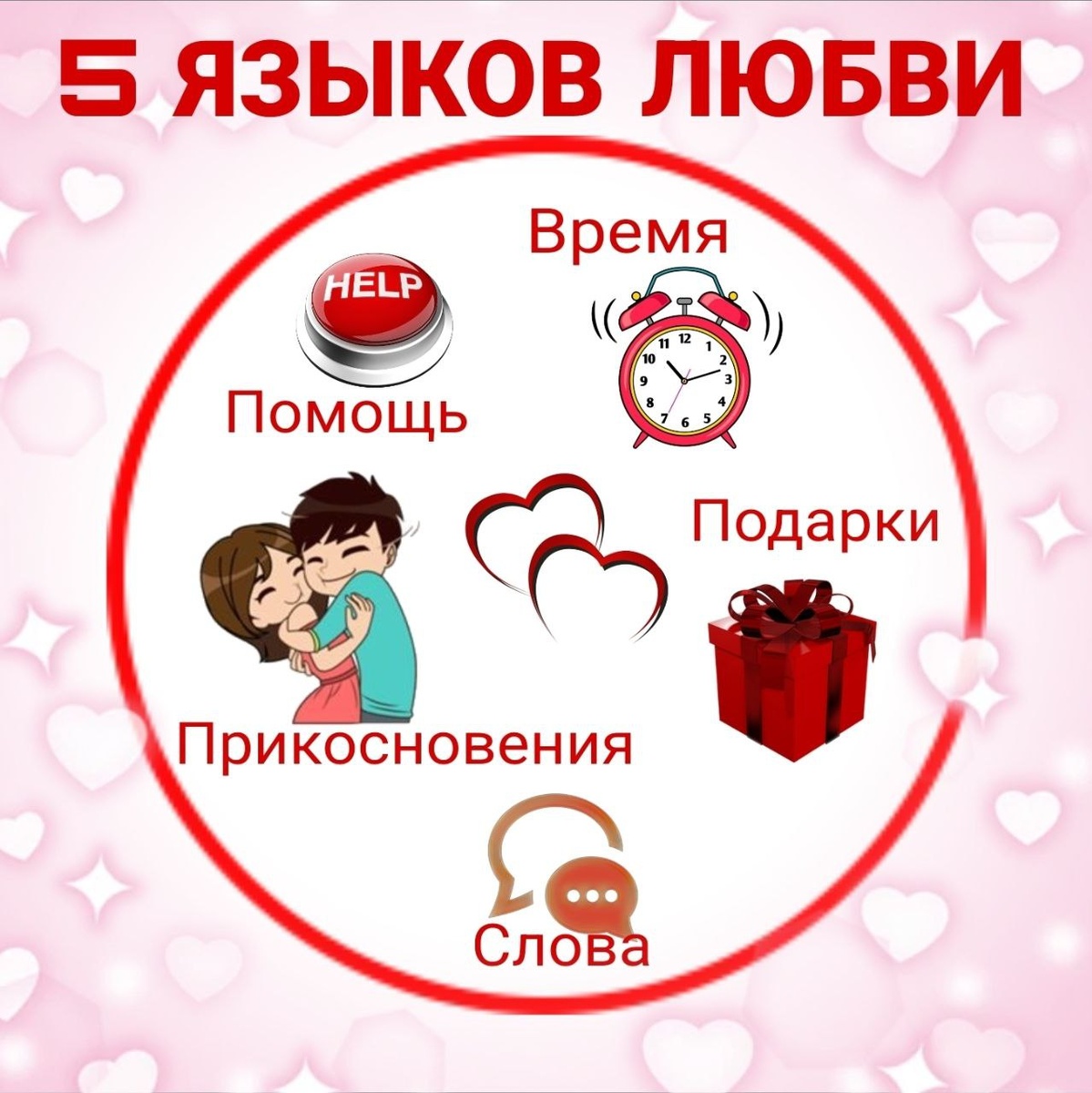 Первая неделя февраля, наша «Карта себя», завершена. Вы проделали огромную внутреннюю работу. И теперь, с этим багажом самоценности, мы плавно переходим к следующему уровню — «Карте МЫ». Всю эту неделю мы будем готовиться к главному событию — мастер-классу «Алхимия отношений» 14 февраля. А начнём мы с простого, но гениального ключика к пониманию любых отношений — с 5 языков любви. 💞 Что это такое и зачем вам это знать? Концепцию 5 языков любви создал психолог Гэри Чепмен. Её суть в том, что каждый из нас по-разному даёт и хочет получать любовь, заботу и признание. Мы часто «говорим» на одном языке, а наш партнёр, ребёнок, друг или коллега — на другом. И пока мы не научимся «переводу», можем годами чувствовать себя недолюбленными и непонятыми. Определив свой ведущий язык и язык близкого человека, вы получаете инструкцию к гармонии 🤍 Кратко о 5 языках: 1. Слова поощрения — искренние комплименты, слова поддержки, вербальное признание. «Я тобой горжусь», «Спасибо, что ты есть». 2. Время