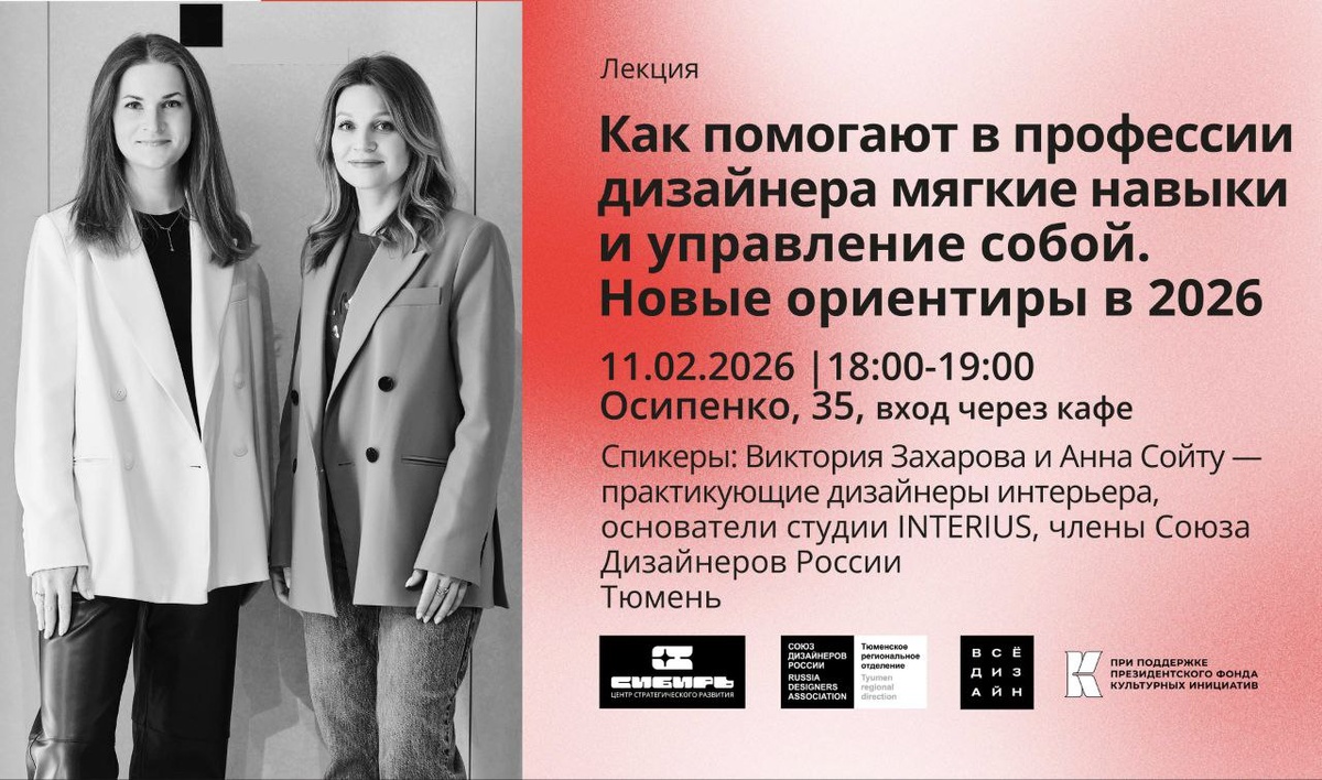 дизайнерами Что ждет в феврале? 💡Лекция: «Как помогают в профессии дизайнера мягкие навыки и управление собой. Новые ориентиры 2026» 🔵Дата: Среда, 11 февраля 🔵Время: 18:00–19:00 🔵Место: Осипенко, 35 | Центр стратегического развития «Сибирь». Вход со стороны ул. Свердлова, через кафе. 🔵Спикеры: Виктория Захарова и Анна Сойту — основатели студии INTERIUS, члены Союза дизайнеров России. 💡Лекция: «Брендинг и деньги при старте бизнеса: страхи, ошибки и реальные кейсы» 🔵Дата: Среда, 25 февраля 🔵Время: 18:00–19:00 🔵Место: Осипенко, 35 | Центр стратегического развития «Сибирь». Вход со стороны ул. Свердлова, через кафе. 🔵Спикер: Светлана Зуева — директор бюро «ГРАФ», член Союза дизайнеров России. 📅 Вход на все события — по регистрации. 🔔 Следите за анонсами в сообществе проекта! Проект реализуется при поддержке Президентского фонда культурных инициатив. Соцсети проекта TG | VK