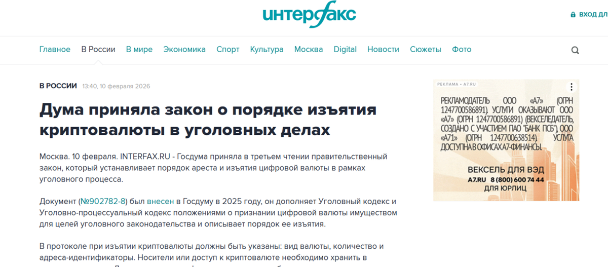 Государственная Дума одобрила в финальном чтении разработанный правительством проект закона, регулирующий процедуру ареста и изъятия виртуальных денежных единиц в уголовном судопроизводстве. Законодательная инициатива №902782-8 была представлена в нижнюю палату парламента в 2025 году. Она предусматривает дополнения в Уголовный и Уголовно-процессуальный кодексы, по анализу которым виртуальные активы признаются имуществом применительно к нормам уголовного права и устанавливаются правила их изъятия. При составлении протокола изъятия криптоактивов необходимо указывать тип цифровой валюты, её объём и идентификационные реквизиты. Средства и устройства, обеспечивающие доступ к криптовалюте, подлежат хранению в запечатанном виде. Если возникает надобность обеспечить сохранность актива, цифровую валюту разрешается перевести на специально предназначенный для этого адрес. Порядок осуществления такого перевода и условия последующего хранения будут определены Правительством Российской Федерации.