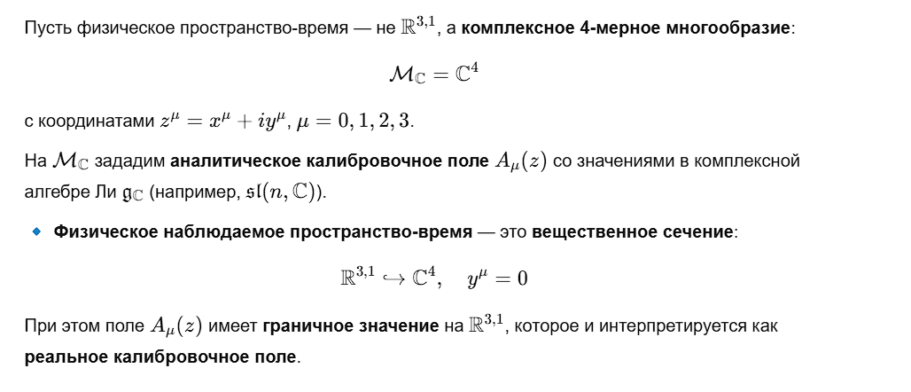 Переход к Стандартной модели 👉 Осталось: ✅ Шаг 6: Строгое существование меры dμ[A] 🔧 Решение: Конструкция через регуляризованную решётку в C4 ✅ Теорема (существование меры): На комплексном пространстве-времени C4 существует уникальная, калибровочно-инвариантная, регулярная мера dμ[A], соответствующая квантовой теории Янга–Миллса. ✅ Шаг 7: Непрерывность сп