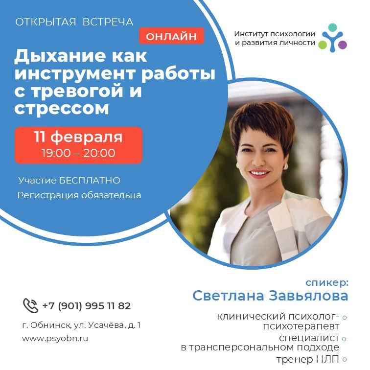 , тревогой и стрессом» Мы обсудим: 🔺виды дыхания 🔺связь дыхания с нервной системой и эмоциональным мозгом 🔺дыхание как способ изменения состояния 🔺как дыхание может быть инструментом работы с подавленными чувствами, тревогой и стрессом ⏰ 11 февраля (среда) | 19:00 - 20:00 💰 Участие БЕСПЛАТНО 📍Регистрация: https://forms.gle/DjQa4UAQAS8wwy8F9 🚩Формат: онлайн, Zoom Еще больше информации о мероприятиях: ВК: https://vk.com/psy_institut_obninsk Телеграм: https://t.me/psy_institut_obninsk 👍 Подписаться | Ваша реклама