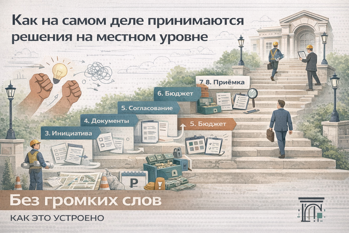 Многие думают: «Депутат сказал — сделали». В реальности даже простое решение проходит через десятки этапов. Сегодня покажу «кухню» муниципального управления без прикрас — от идеи до реализации. Никаких лозунгов, только факты и механика процессов. Источник может быть любым: Пример: жители просят установить фонари во дворе. На этом этапе выясняют: Если решение возможно, готовят: На этом этапе часто привлекаются профильные специалисты: инженеры, юристы, экономисты. Проект проходит через несколько ведомств: Каждый даёт замечания — документ дорабатывается. Даже если все согласны, нужны деньги. Варианты: Если денег нет — процесс останавливается до следующего бюджетного цикла. По закону (44‑ФЗ) для работ свыше определённой суммы нужен конкурс. Этапы: Этот этап может занять от 30 дней. Подрядчик выполняет работы под контролем: Создаётся комиссия, которая проверяет: Только после подписания акта выполненных работ проект считается завершённым.
