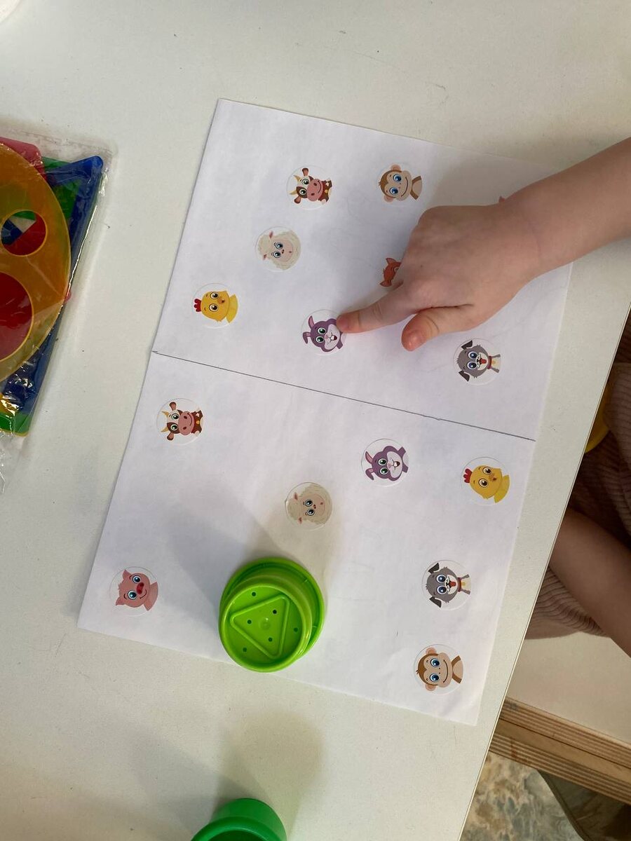 взрослый показывает на одном листе животное - ребёнок должен показать такую же наклейку на другой половине листа; взрослый закрывает животное - ребёнок должен назвать, кто спрятался (сопоставить и найти, кого не хватает); ребёнок показывает одинаковых животных двумя руками/закрывает стаканчиками. -повторить по образцу (повторение геометрических фигур: в квадратики наклеить зебру, в треугольники - слона, в круг - панду и тд). Усложнение: дать инструкцию только на слух (развитие аудиального внимания и оперативной памяти), без опоры на визуальный образец.