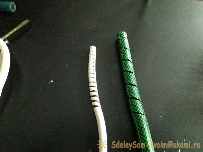 Во время строительных или ремонтных работ мы не всегда точно рассчитываем необходимое количество материалов. Иногда по завершении ремонта может обнаружиться, что какого-то из них не хватает. Некоторые люди так торопятся завершить ремонт, что работают до поздней ночи, несмотря на недовольство соседей. Но рано или поздно приходится прерваться, если заканчивается хотя бы один из материалов, а в магазин уже поздно идти. Однако решение есть всегда. В этом мастер-классе мы рассмотрим монтажную спираль. Можно, так же применить, эти витые жгуты для укладки компьютерных проводов под компьютерным столиком, во избежание их путаницы. Монтажная спираль или витой жгут – не обязательный элемент, но с ними процесс укладки проводки в стене или электрокороб пойдёт быстрее. Если в одну канавку укладывается несколько проводов, витой жгут поможет избежать их разброса. В случае отсутствия спирали можно использовать шланг подходящего диаметра. При любом строительстве шланг (или отрезок шланга) обычно есть в