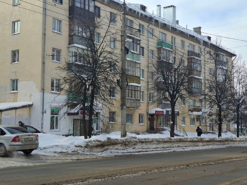 Глыба льда рухнула прямо перед людьми с крыши дома на улице Советской в Костроме