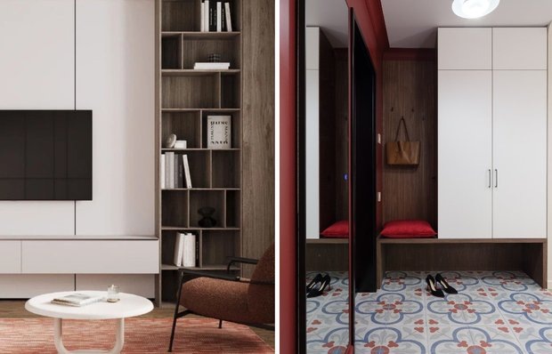 Важный момент: системы хранения должны быть не только функциональными, но и зрительно восприниматься легко. Асимметричные стеллажи из натурального дерева, встроенные шкафы без ручек и скрытые ниши помогают создать ощущение порядка и добавляют пространству воздушность.