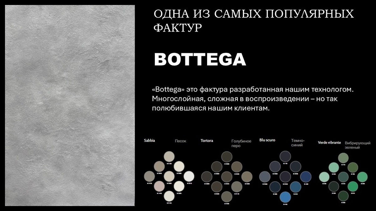 Фактура BOTTEGA это бесспорный лидер года ушедшего и наступившего! Она довольно сложная в нанесении, потребуются работы профессионального декоратора, но результат однозначно того стоит! На создание этого образца, нас вдохновили наши заказчики! Увидев, в очередном из своих путешествий - "невероятной красоты стену". Пришли к нам в салон, показали фото и сказали - "ХОТИМ ТАК!" И конечно же мы не отказались и ввязались в эту авантюру! Результат превзошел все ожидания! Заказчики в восторге- мы тоже! В следующих постах, мы обязательно поделимся фотоотчетом уже с объекта! Подписывайтесь, что бы не пропустить!)