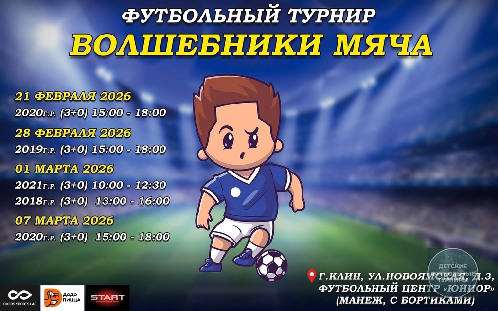 » 🗓 21 ФЕВРАЛЯ 2020 г.р (3+0) до 6 человек в составе 🗓 28 ФЕВРАЛЯ 2019 г.р (3+0) до 6 человек в составе 🗓 1 МАРТА 2021 г.р (3+0) до 6 человек в составе 2018 г.р (3+0) до 6 человек в составе 🗓 7 МАРТА 2020 г.р (3+0) до 6 человек в составе 🏟1 игровое поле (18м*12м ), ворота 1,5м*1,5м (манеж, искусственный газон,с бортиками) ⏱Игра - 10-12 минут 🎯Место проведения: г. Клин, ул. Новоямская, 3 🏅Участвует 5-6 команд, одна группа в круг ✔ 4-5 игр у каждой команды ⭐Индивидуальные награды лучшим игрокам команды и лучшим игрокам турнира 🥇🥈🥉Всем футболистам медаль за участие 🏆 Победитель и призеры получают Кубок 🎁 Бонусы от наших партнеров 📊 Онлайн таблицы 📸 Профессиональный фотограф 🎵 Музыкальное сопровождение Подробная информация по телефону:+7(967)217-68-59 Артëм Детские футбольные турниры (https://vk.com/club229357070) Развлекательный центр "START" (https://vk.com/club217790755) Cikers | Спортивный бренд (https://vk.com/club191265179) Додо Пицца Клин (https://vk.com/club1