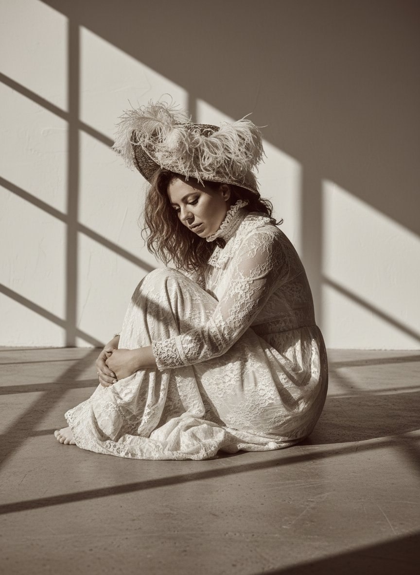🎨 Промпт: A portrait of the woman from the reference photo, maintaining her exact facial features and identity. She sits curled on the raw concrete floor of a modern minimalist apartment, looking down in a melancholic and introspective mood. She wears a romantic Victorian-inspired lace gown with a high collar, paired with a dramatic feathered hat. The shot uses a dynamic dutch angle to heighten the emotional tension. Lighting creates harsh, graphic midday shadows from window frames cutting across the white walls, contrasting with the overall soft, diffused overcast glow. The scene is rendered in vintage sepia tones, blending period costume with sleek modern architecture. High fashion photography, detailed texture, 8k resolution. Банк Промптов | Твои Идеи
