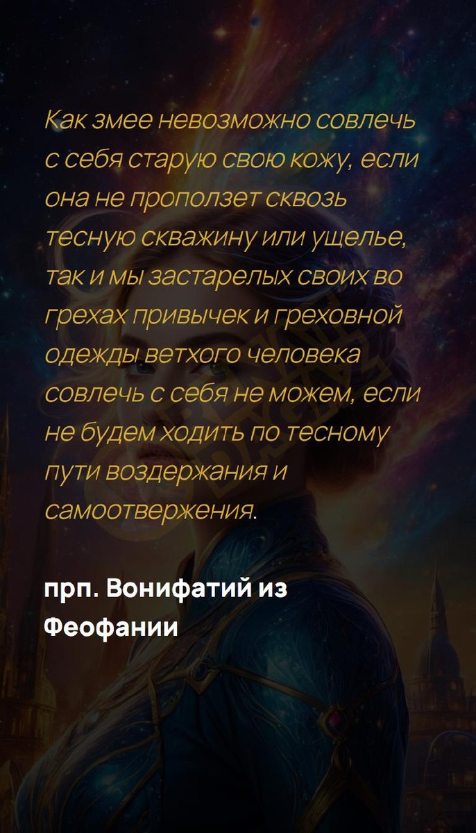 Как змее невозможно совлечь с себя старую свою кожу, если она не проползет сквозь тесную скважину или ущелье, так и мы застарелых своих во грехах привычек и греховной одежды ветхого человека совлечь с себя не можем, если не будем ходить по тесному пути воздержания и самоотвержения. прп. Вонифатий из Феофании Архитектура вашей души | Ваш Ангел и Демон T | VK | Pin | YouTub | Dzen #результат #жизненнаясила #впотоке #прорыв #любовьксебе #люди #ментальноездоровье #честность #чудокаждыйдень #10число #10февраля