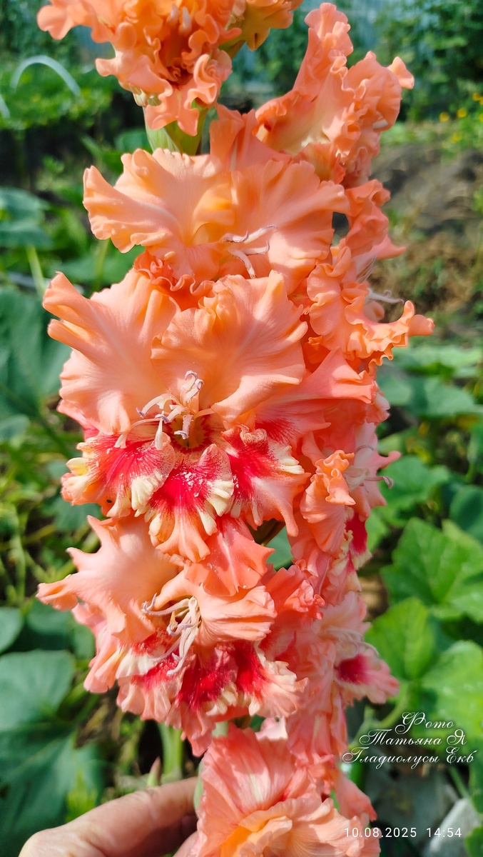 527-С-1997 - Громов-СГ Яркий лососево-оранжевый с рябиново-красным оттенком, на нижнем лепестке вишневое пятно в кремовом окаймлении. Красивая гофрировка складками и защипами. Ткани лепестков плотные, искрящиеся на солнце. Соцветие прочное, двухрядное, средней плотности, на длинном стебле. Красивый сорт горящей окраски. Он, как осенняя роща. Хорошие ростовые качества. Отличная срезка. Осталось пара комлектов деток. Детки мелкие, поэтому кладу больше.