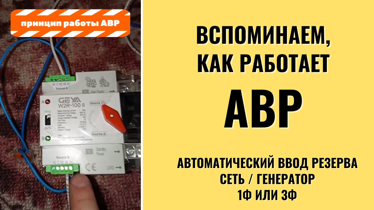 Держите, кто не знает, как подключать генератор через АВР в своём щитке. По сути это работает как перекидной контактор с двумя гальванически развязанными вводами. Если 1ф ввод, генератор, соответственно, тоже по любому однофазный, и АВР должен быть двухполюсным, как на первой схеме: Если щиток трехфазный, генератор может быть 1ф или 3ф, и нужен 3-полюсный или 4-полюсный (лучше) АВР. Сам по себе АВР не управляет ничем, есть перекидной сухарь (сухие контакты) на каждом вводе и больше ничуя. Встроенные сухари просто показывают какой ввод включён, до того как переключится рубильник они никуда не переключатся, по сути годятся только для индикации. Подробнее смотрите в видео, потому что лучше увидеть, чем прочитать: Чтобы управлялся генератор, надо именно доп релюшку поставить, которая будет ему пусковое реле замыкать. Основной вал там пластиковый, на нём металлическое коромысло с пружинами, которое двигается при помощи электромагнитов, и соответственно в этот же пластиковый вал непосредс
