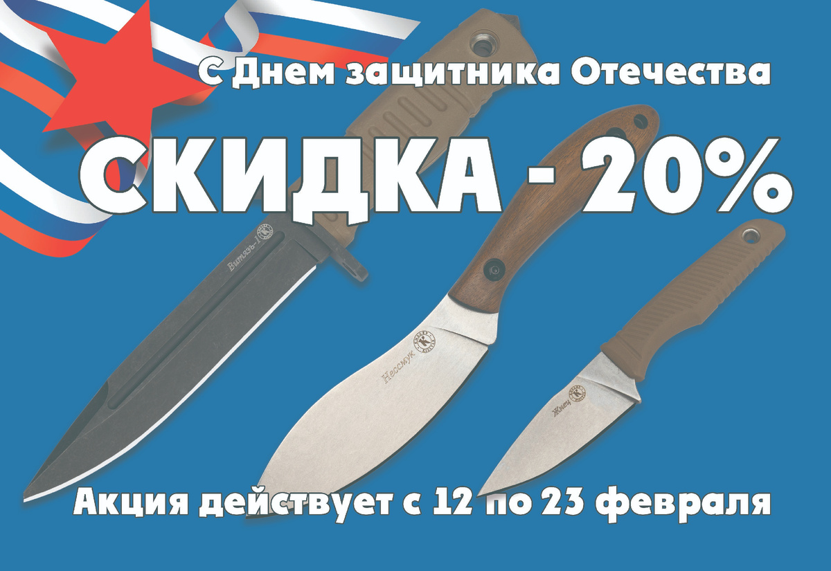 В честь Дня Защитника Отечества объявляем СКИДКУ 20% на весь наш ассортимент акция действует на розничные магазины. Магазин при заводе. г. Кизляр Кизлярский район, ул. Цеховая д.5 Розничные магазины: г. Кизляр ул. Грозненская , 87 "а" и г. Кизляр 140 километр автодороги Махачкала-Астрахань. Ищите подарки для настоящих мужчин Приходите к нам Спешите! Акция действует только до 23 февраля.