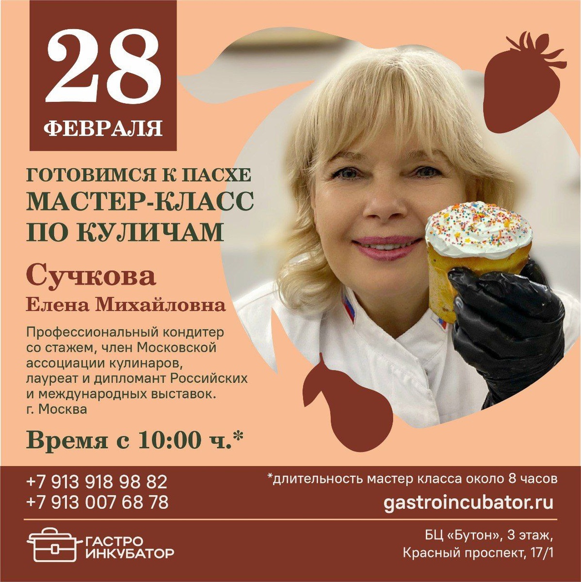 ! Приглашаем вас на эксклюзивный экспресс-мастер-класс от легенды кондитерского искусства! Для вашего удобства 2 дня в одном! 28 февраля в 10:00 в «Гастроинкубаторе» московский кондитер Елена Сучкова раскроет секреты приготовления идеальных пасхальных куличей. В программе — рецепты на опаре и закваске: ✅Изысканный Премиальный кулич ✅Ароматный Апельсиновый кулич ✅Итальянский Кулич «Панаттоне» ✅Классический Кулич на закваске ✅Нежный Кулич с улучшителем. Ваш наставник — Сучкова Елена Михайловна: ✔Мастеркондитер с 25-летним стажем, член Московской ассоциации кулинаров. ✔Лауреат российских и международных выставок, неоднократный победитель Кубка Мира по кулинарии в Люксембурге. ✔Главный кондитер Школы шоколада, признанный специалист по десертам «от кутюр». ✔Автор тортов для Пьера Ришара, Валентина Юдашкина и других звезд. Это не просто урок — это вдохновение от лучшего! Количество мест ограничено. Забронируйте участие и испеките свою идеальную Пасху! +7 913 916 9882✨