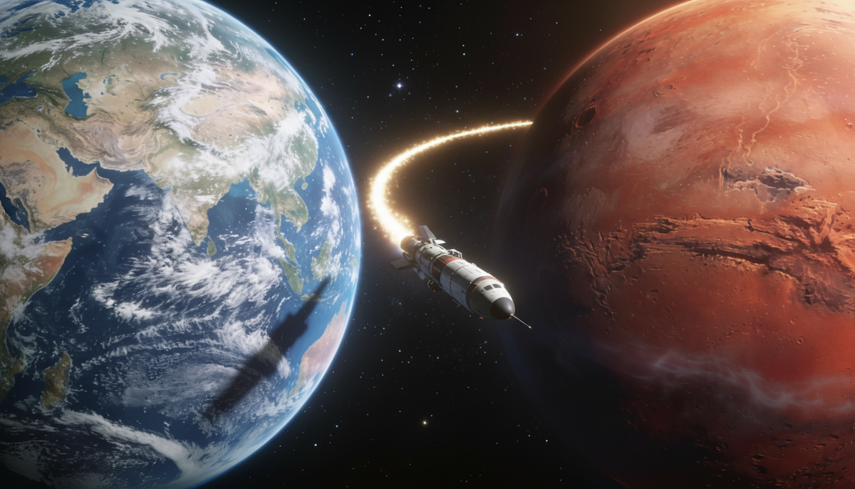 Эта траектория требует всего двух включений двигателей: один разгон у Земли, один тормозной импульс у Марса. Всё остальное время аппарат просто падает по эллипсу вокруг Солнца.