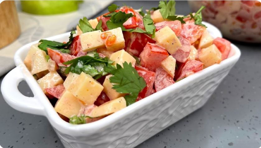Один из самых приятных моментов — это когда читатели делятся своими находками. Не так давно одна из моих подписчиц прислала рецепт салата с очень красивым названием «Наргиз». Я его тут же сохранила, а когда попробовала — поняла, что это именно та простая, свежая и очень удачная закуска, которой можно и гостей удивить, и семью накормить за пару минут. Его главная прелесть в том, что основа — всего три продукта, которые почти всегда есть под рукой, а результат получается очень гармоничным, сочным и с интересной вкусовой игрой. Основу салата, как и следует из названия, составляют три кита: помидоры, сыр и яблоко. Помидоры я беру мясистые, чтобы давали минимум лишнего сока. Мою их, режу небольшим аккуратным кубиком и, если они всё же очень водянистые, слегка откидываю на сито, чтобы салат потом не «поплыл». Сыр — это простор для фантазии. Подойдёт любой твёрдый или полутвёрдый сыр, который вам нравится: от классического российского или гауды до чего-то с более пикантным вкусом. Его я нарез