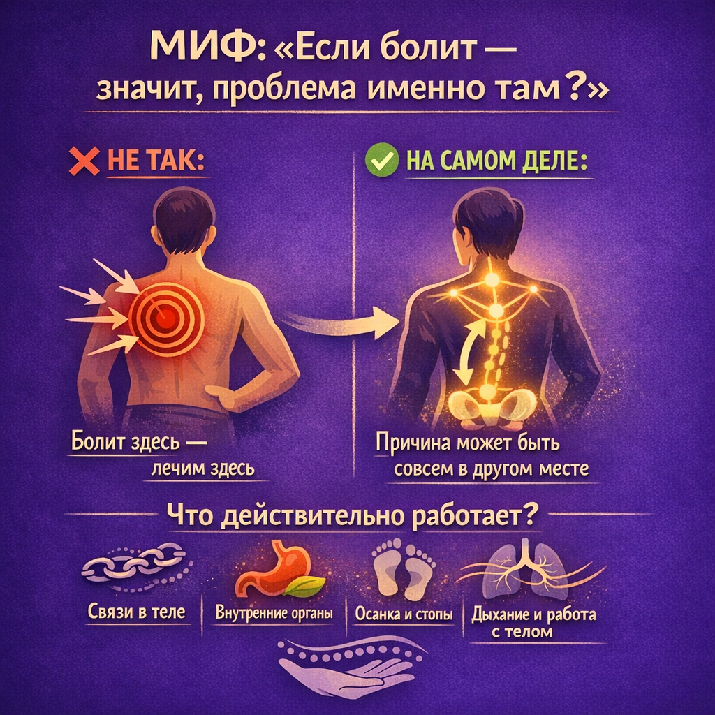 👉 «Проблема именно там, где болит». Именно с этой логикой большинство людей начинает работать с телом.