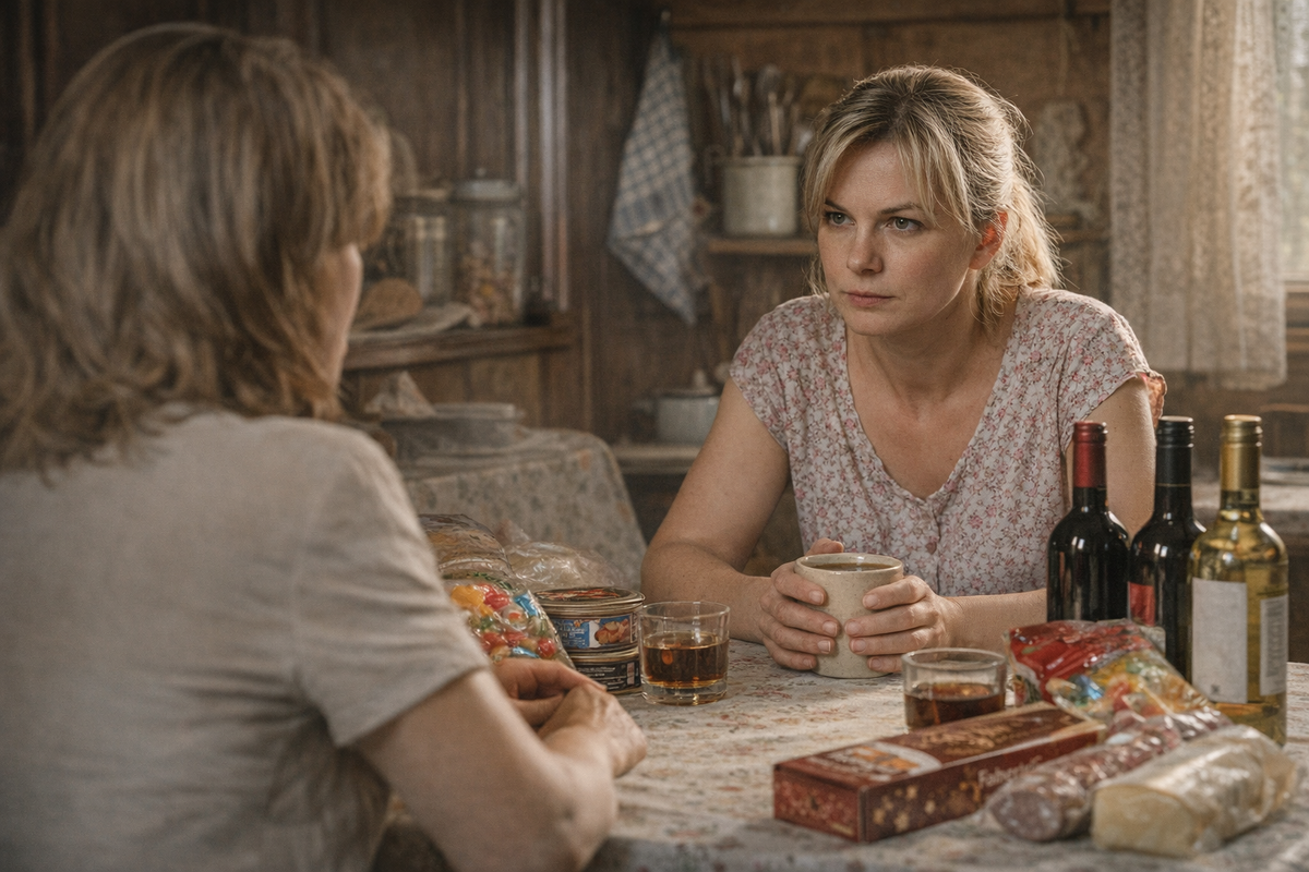 Покончив с бельём, вытирая ладони о подол платья, Лена ведёт меня в прохладную полутьму домика. Внутри пахнет деревом, чистотой и сладкой сдобой. За ситцевой занавеской в углу тихо посапывает Катюша. Лена указывает мне на стул за кухонным столом, покрытым чистой клеёнкой в мелкий цветочек. Я, словно оправдываясь за своё вторжение, начинаю выкладывать на стол всё содержимое пакетов: консервы и хлеб, фрукты и яркие коробки конфет, пакет со сладостями, и, наконец, с глухим стуком ставлю три бутылки вина.