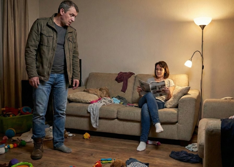 Андрей зашел, и его взгляд тут же, словно тепловизор, нашел «проблемные зоны». Он не заметил запаха пирога, проигнорировал чистый пол в коридоре. Он увидел кубики на ковре и, главное, — стопку выстиранного белья и его рубашек на краю дивана. Ту самую, которую Марина физически не успела разложить по полкам, потому что укачивала раскапризничавшуюся дочь.