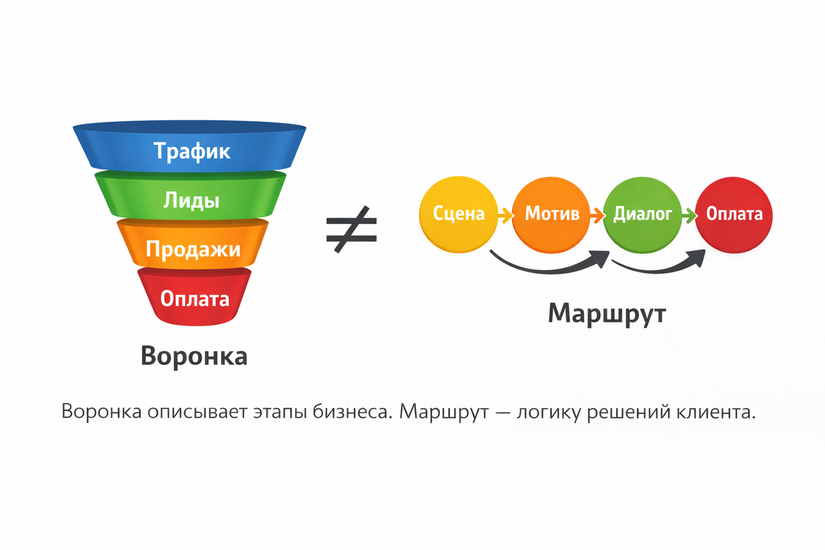 А человек живёт в реальности, а не в этапах «трафик → лид». Классическая воронка продаж выглядит логично: Но у неё есть один минус, о котором редко говорят. 👉 Воронка не отвечает на вопрос, что происходит в голове человека между шагами. Почему он: Для воронки это «выпал и вернулся».