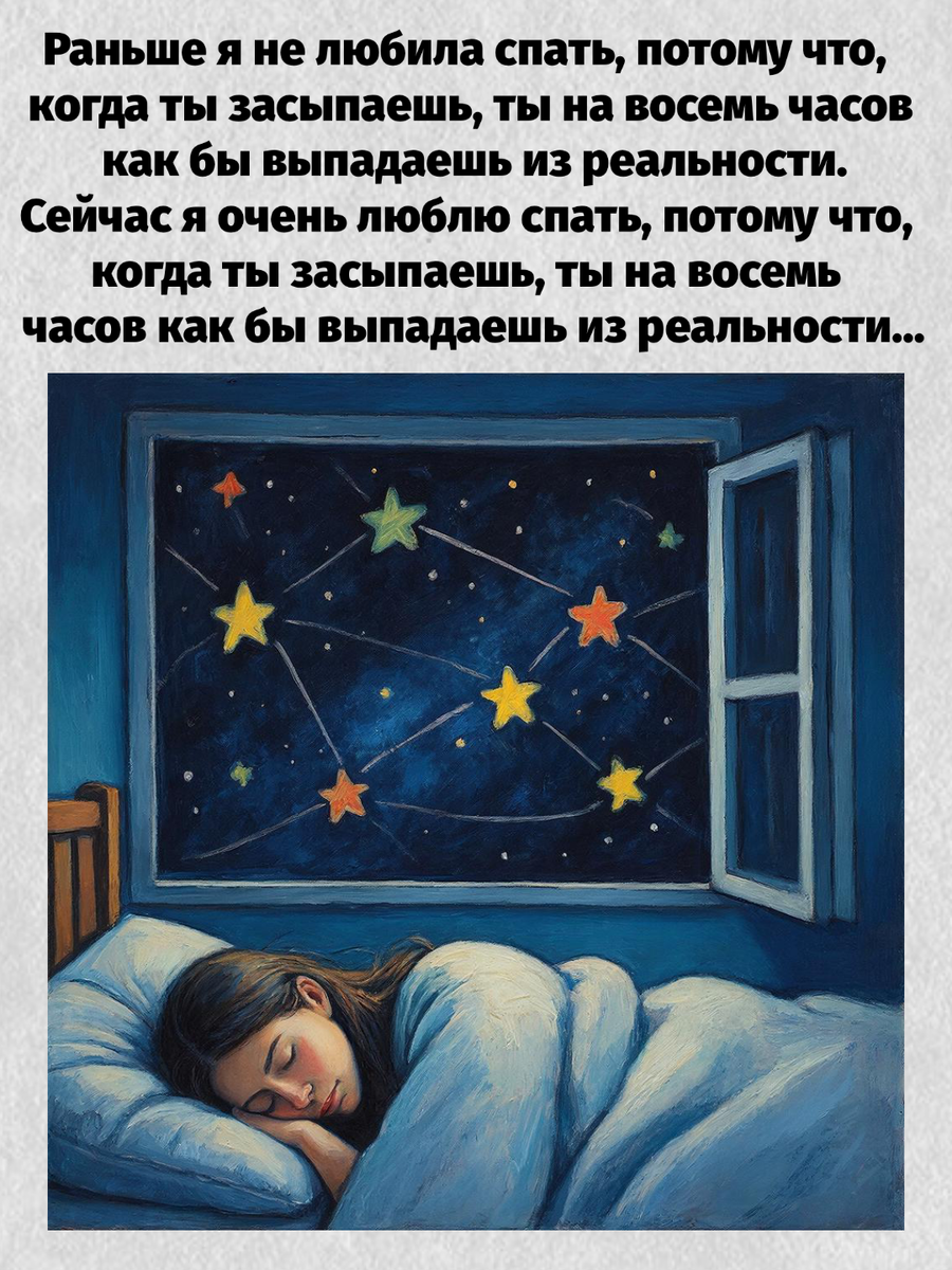 Вот такая она странная штука, наша жизнь. Когда ты маленький, и тебя ничего не тревожит, нет никаких обязательств и обязанностей, конечно же, хочется чтобы день длился бесконечно и был наполнен радостными моментами. А во взрослой жизни, когда в голове сидят одни бесконечные проблемы, и ты уже устал их решать, то хотя бы на сон хочется выпасть из такой реальности.