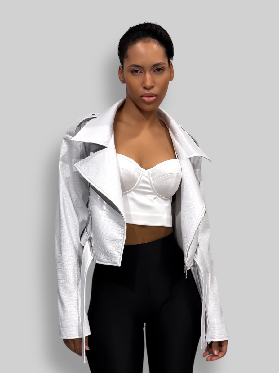 Белый в одежде — это тишина и уверенность одновременно. Он не старается понравиться, но притягивает взгляд. Про чистоту, свежесть и ощущение «всё на своих местах». Белый всегда выглядит дороже, чем есть, и говорит о вкусе без слов. Укороченная белая косуха с тиснением «сroco» Модель выполнена из премиального материала с выраженным фактурным тиснением, имитирующим кожу крокодила. Чистый белый цвет и умеренный глянцевый блеск подчеркивают глубину рисунка и премиальность изделия. Размеры: S, М