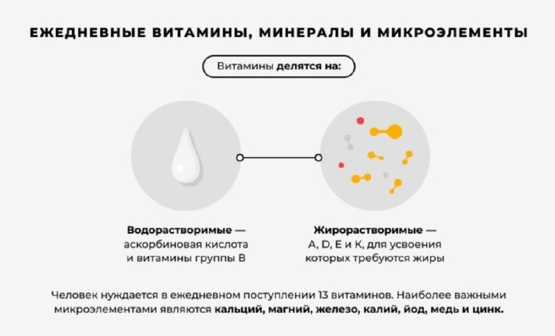 жизнедеятельности. Человек способен синтезировать такие сложные молекулы, как белки, жиры и углеводы. При этом ряд веществ организм не может производить самостоятельно, например, незаменимые аминокислоты и витамины. Витамины – это органические соединения, которые жизненно необходимы человеку, так как играют ключевую роль во всех биохимических процессах. Они участвуют в обмене веществ и обеспечивают нормальное функционирование клеток, органов и систем организма. Недостаток витаминов приводит к серьезным болезням, а авитаминоз – даже к летальному исходу. Классическим примером служит дефицит витамина С, вызывающий развитие цинги и гибель человека. Поэтому витамины являются незаменимой частью нашего рациона, и их поступление извне (с пищей или в форме препаратов) критически важно для здоровья. Этот факт говорит о необходимости сбалансированного питания и, при необходимости, использования добавок и витаминных комплексов. Какие витамины нужно принимать человеку ежедневно? Человек нуждается