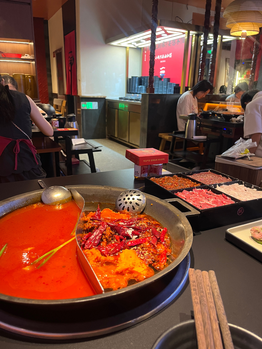 Нельзя говорить о еде в Китае и не упомянуть hotpot — формат, который особенно популярен среди туристов. Суть простая: вам приносят кастрюлю с бульоном и специями (мы брали томатный и острый), а дальше вы сами выбираете, что будете в нём варить.