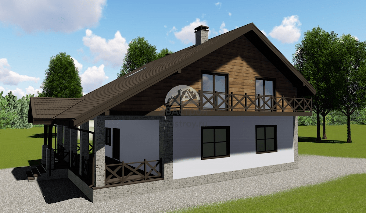 Номер проекта: 107-18 (П60) Разделы проекта: Архитектурный и Конструктивный разделы Узнать о проекте больше можно на сайте evastroy.ru или по телефону +7 (495) 175-30-40 Двухэтажный коттедж с мансардой выполнен в европейском стиле, с элементами стиля шале. Это прекрасный выбор для постоянного проживания и загородного отдыха. Дом рассчитан на пять человек, его общая площадь 243 м2, габариты — 15.65 x 11.12 м. Состав помещений: 4 спальни, гостиная, кухня, 2 санузла, ванная, бойлерная, коридор, холлы. Преимущества проекта: реализуется по надежной кирпичной технологии; предусмотрена крытая терраса и балкон; возможно проживание гостей. Просторные холлы, соединенные широкой трехмаршевой лестницей. Под верхними пролетами лестницы отлично поместится гардеробная зона. Помещения-водопотребители (санузлы, кухня, бойлерная) собраны в компактную группу. Столь же компактными будут и коммуникации, а единый выход канализации повышает рациональность всего дома. Технические помещения (бойлерная и санузл